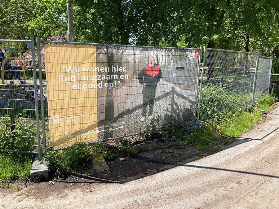 Verder zijn er waarschuwingsdoeken geplaatst om er zo voor te zorgen dat iedereen gewaarschuwd wordt en alert blijft voor de aanwezigheid van zwaar bouwverkeer als hij of zij door het park loopt.